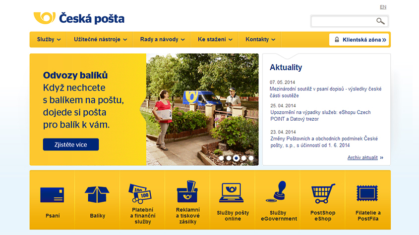 Pro hlavní webový portál České pošty jsme na začátku roku 2014 připravili zcela nově přepracovaný grafický návrh, který vystihuje požadavky zadavatele na moderní vzhled a zároveň nabízí intuitivní ovládání a přehlednou strukturu. Společně s grafickým návrhem jsme zpracovali HTML šablony, které jsou nasazeny na podnikovém portálu Liferay, založeném na jazyce Java.