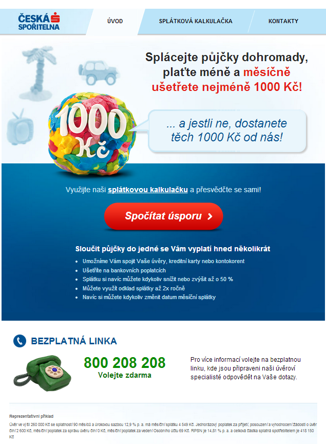 MEDIA FACTORY bezpochyby nesplácala jen tak nějakou stránku, ale vytvořila zbrusu novou a nápaditou microsite, zcela zaměřenou na produkt od České spořitelny- nově obohacenou konsolidaci půjček o akční nabídku v podobě tisícikorunové úspory nebo vyplacení 1000 Kč jako bonus. Přehledně, intuitivně a především užitečně působí pro klienty celá microsite, díky které můžete jen získat.
